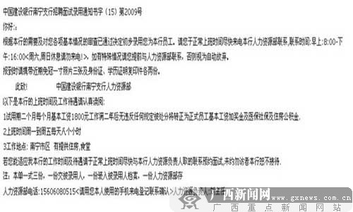 網友“lqqlauren”發帖稱,她即將畢業的妹妹最近收到一份“中國建設銀行南寧支行的面試錄用通知書”,錄用通知書上標注的工作待遇極具有誘惑力,試用期工資1800元/月,轉正后還有獎金、醫保、社保、住房公積金。通知書最后留有“人力資源部劉主任”的手機號碼和一個“95533nn@163.com”電子郵箱。