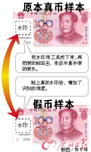 犯罪嫌疑人采用挖補方式,將真幣的水印挖出來后,用膠水粘貼到假幣當中,原來的真幣則填充上假的水印,填充上假水印的真幣也成了假幣,“這樣100元就變成了200元,嫌疑人造出假幣后就馬上到柜員機存入假幣,再到另一個柜員機取出真幣,繼續偽造。”