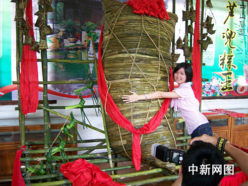 詹園一負責人對記者稱:“中山美食馳名天下,但中山特色蘆兜粽卻沒有多少人知道,但凡說到廣東粽子美食,大家印象中就只有肇慶的裹蒸粽了。其實蘆兜粽無論淵源還是口味都不亞于裹蒸粽!睋,端午小黃金周將近,中山詹園特意推出1.88米高、608斤重的蘆兜粽王,讓游客親自體驗中山粽的美味,更欲為中山蘆兜粽一爭“粽”名。