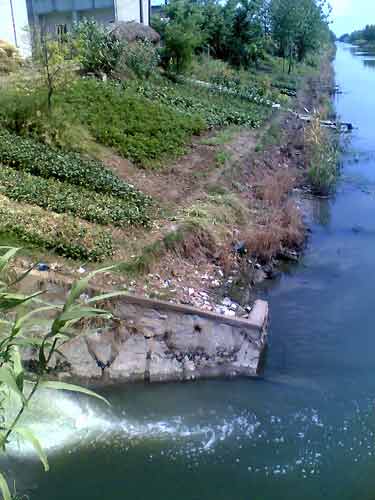 記者順著指引,沿這條戰備河而上,走不多遠,終于在盛家村發現了一片綠水與乳白色交融的水域。河東岸橋頭一簇蘆葦的后面,一股污流正呈90度角泄入河中。通過觀察水面泡沫的走向,記者發現這股污水正潛向不遠處的水廠取水口。