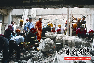 9時50分,湘潭市雨湖、特勤兩個消防中隊火速趕赴現場,當時已有一名被困者被成功救出,另有一名民工的下半身被死死壓住,動彈不得;其上半身被砸得遍體鱗傷,胸口正好卡在斷裂的房梁下,血流不止。