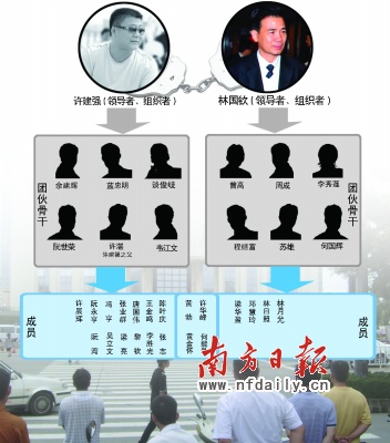 許建強(qiáng)為首成立了“閘坡鴻發(fā)水產(chǎn)品購銷部”等一系列公司,以暴力、脅迫等手段實施故意殺人、故意傷害、敲詐勒索、強(qiáng)迫交易和非法收取保護(hù)費(fèi)等違法犯罪行為,壟斷了陽江部分地區(qū)的海鮮、冰條、螺仔、三鳥、沙石、煤氣、客運(yùn)、運(yùn)輸物流市場。林國欽為首則成立了信誠寄賣行等一系列公司,同樣以暴力、脅迫手段實施了故意傷害、強(qiáng)迫交易、非法經(jīng)營等違法犯罪活動,基本壟斷了陽江的水泥銷售市場,在追收非法債務(wù)過程中,逼迫他人以山林、廠房抵債,大肆掠奪他人或企業(yè)財產(chǎn),甚至導(dǎo)致有的企業(yè)破產(chǎn)倒閉。陽江地區(qū)的社會穩(wěn)定及經(jīng)濟(jì)發(fā)展受到了嚴(yán)重影響。