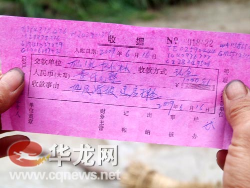 聞聽記者在當地采訪,村民楊仁林的妻子將隨身攜帶的押金收據拿出來展示,楊仁林家編號為0018422號的白條“收據”上顯示,其收款事由為“‘地質滑坡建房押金’壹仟元整”,交款時間為2009年6月16日,經辦人:“武”。收據左右角上注明了其交款面額的編號。