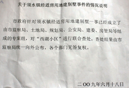 在落款時間為2009年6月18日的“關于須水鎮經適房用地建別墅事件的情況說明”中顯示:“市政府針對須水鎮經適房用地建別墅一事已經成立了由市監察局、土地局、規劃局、公安局、建委、房管局等組成的專案組,對“西湖小區”進行聯合查處。查處結果由市監察局統一向外公布,各個部門無答復權!