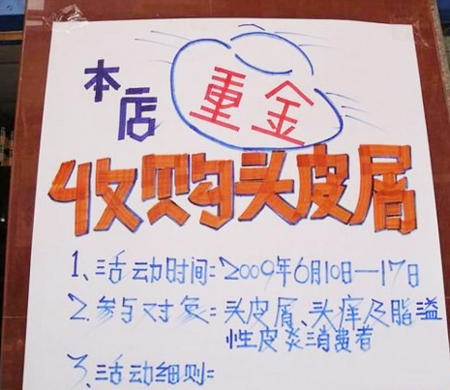 在朝聞網、搜狐社區、新浪論壇上,一篇名為《暴強!藥店竟然收購頭皮屑》的帖子,引發網友熱議。帖中說,自己在經過住地附近的一家藥店時看到,店門口竟貼出一張海報要收購頭屑!這可怎么算,按斤稱?論兩算?不是,是以片兒算,店方開出了每片頭屑100元的天價。樓主驚嘆,見過收廢品收古董啥的,“這回我真是被雷著了!我看這藥店老板肯定是個腦殘,還不如直接送錢好了……”
