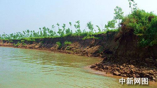 記者現場看到,50多條船滿載石頭,在江中心拋石作業。江兩岸被江水沖刷,有的地方發生崩岸,整棵樹倒伏在江岸。