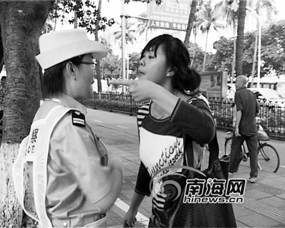 當天下午4點45分,22歲女大學生小蕊走出銀龍影城橫穿6個車道后,在首力大廈被現場執勤的海口交警攔下。當交警告知她,翻越護欄橫穿馬路屬于交通違法行為需接受處罰時,小蕊聲稱自己是第一次,身上也沒帶錢,隨后便開始“發飆”了。“你她媽的xx,我x你媽。”這名女大學生開始對交警進行辱罵。海口市交警支隊一名負責攝像的工作人員對這一過程進行錄像時,女子一把抓過攝像機準備砸在地上時,被交警及時制止,“你要是砸了錯就更大了”。