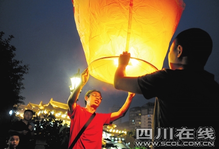 晚8點(diǎn),合江亭邊天色還未全暗,“范跑跑”身著紅色T恤、休閑短褲和一群藝術(shù)家安靜地坐在竹椅上等候。8點(diǎn)30分左右,德籍華人藝術(shù)家蔡青招呼眾人,《祈愿》正式開(kāi)始,范跑跑徑直走向安放孔明燈的紙箱旁。“我們的孔明燈是從臺(tái)北郵購(gòu)過(guò)來(lái)的。除了要用孔明燈為地震逝者祈愿,還寓意海峽兩岸人對(duì)生命的尊敬。下面我和范老師將共同放飛孔明燈,愿意參與的市民都可以加入。”蔡青是此次活動(dòng)的主要發(fā)起人,作為常年旅居國(guó)外的德籍華人藝術(shù)家,蔡青說(shuō)多次前往映秀、北川等災(zāi)區(qū),大片廢墟令他很震驚。蔡青點(diǎn)燃孔明燈后,邀請(qǐng)“范跑跑”和他共同扶住燈的底框,將高達(dá)1米左右的孔明燈逐個(gè)放飛。