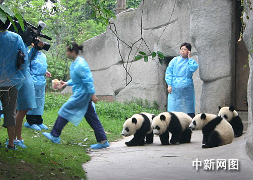 中新網成都7月22日電 (霍潺) 七月二十二日早上約八點半,成都大熊貓基地九個月大的大熊貓貝貝和同伴迎迎、大毛總共六只大熊貓在飼養員的陪同下歡快地跑出獸社,來到“幼稚園”玩耍。