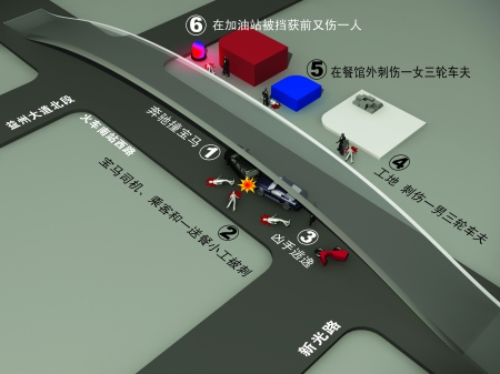昨日中午12時許,一輛奔馳車和一輛寶馬車在(成都市)火車南站西路追尾。車禍發生后,奔馳車司機用兇器刺傷寶馬車上兩名女子和一名送餐小工。據知情人士稱,寶馬車上一名女傷者是市內某大型家具城老板的妻子。隨后,奔馳車司機往火車南站方向跑去,一路上,先后刺傷了兩名火三輪司機,最后跑進距現場100多米的加油站,在刺傷一人后,被眾人合力捉住。