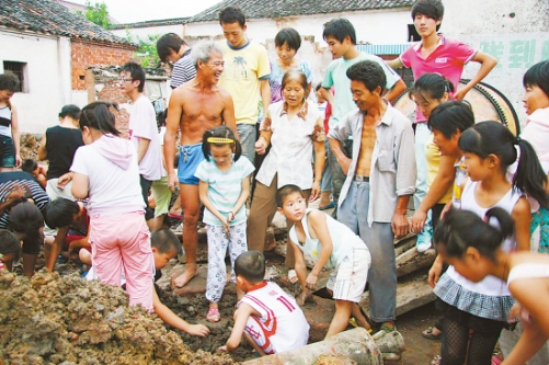 埋著銀元的泥土是來自樟三村中間的一處舊宅基地內,所以當記者趕到那里時,發現約100平方米的宅基地早被200多個村民堵得嚴嚴實實,個個滿身泥污,掘地尋寶。