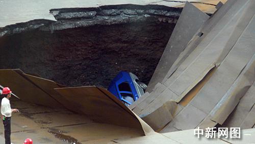 記者在現(xiàn)場看到,此路段實行交通管制,救援人員正在現(xiàn)場緊張施救。一輛藍色出租車還在塌陷坑中沒有被拖出,傾斜在塌陷洞旁的汽車已被拖走。