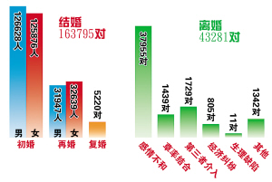 新人笑,離人哭,每個婚姻登記處每一天都在上演不同的悲歡離合。2009年已經過了一半,半年來,有163795對新人走進婚姻殿堂,又有43281對夫妻分道揚鑣。昨日,本報邀婚姻專家剖析這半年的婚姻現象,并為不同年齡不同婚齡讀者支招。