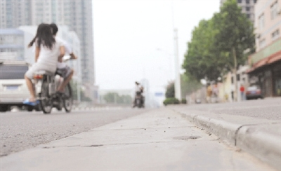 提起這段路,家住桐淮小區(qū)的陳大爺有話要說:“我們在樹下乘涼時,經(jīng)常看到有人摔倒,摔得都可厲害。”“倆月來,幾乎每天都會看到有人摔倒。騎自行車、電動車的都有。”一旁的王阿姨快人快語。她說,主要是路面高度問題,再加上市民騎車時并沒注意到這個臺階,才導(dǎo)致前車輪上不來,車倒人傷。“前天一個女的騎電動車,還帶著孩子呢,上臺階時,大人和孩子一起摔下來。車摔壞了,車身上的塑料板碎了一地。人也站不起來,打電話喊來家人用面包車送到醫(yī)院。”