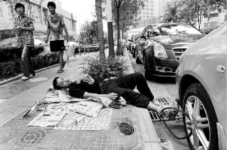 洪作剛說,他擔(dān)心即使通過法律途徑對方也不肯還錢。于是,8月13日下午,他買來一把U型大鎖,白天就將車鎖在下水道鐵柵欄上,連著3天晚上,怕自己睡著、老板將車開走,他就將鎖子的另一頭鎖在自己的腳踝上。晚上,他就睡在馬路邊的報(bào)紙上,路邊蚊子多,他就在周圍點(diǎn)上四盤蚊香。