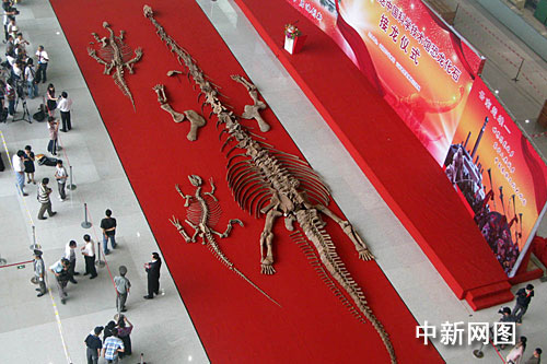 中新網(wǎng)北京8月18日電 (記者 孫自法)三具侏羅紀時期的恐龍化石,十八日下午在它們的“新家”——中國科學技術(shù)館新館揭開“紅蓋頭”,正式由云南省楚雄彝族自治州“嫁”入北京落戶中國科技館新館,并將于下月中旬新館開放后進行永久性展出。