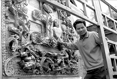 昨天上午,在豐臺區京石高速公路西道口附近,來自湖南婁底市新化縣的曹永文和他的大型木雕作品“中國興”,吸引了不少過往行人。一個多星期前,曹永文帶著他的這件木雕作品,從湖南老家出發,欲進京將此作品獻給人民大會堂或國賓館,以慶祝建國60周年。