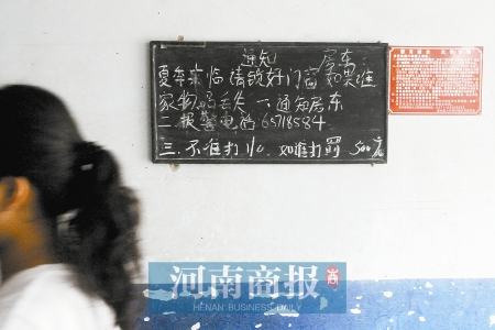 李先生是這棟樓的房東,身后墻壁掛的黑板上,寫著一則通知:“夏季來臨請鎖好門窗,如果誰家物品丟失:一、通知房東;二、報警電話65718584;三、不準打110,如誰打罰500元!