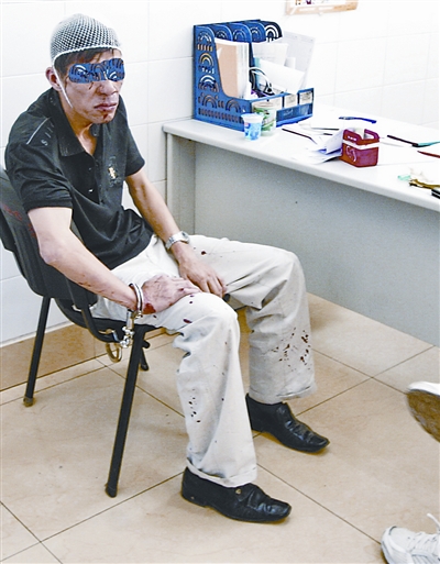 昨日(26日),一血流滿面的中年男人戴著手銬,被警察帶進(武漢)市六醫院急診室,該男子是因偷車而被市民打成這樣的。