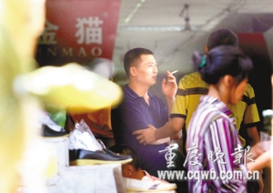 在1995年曾發(fā)生特大火災(zāi)的朝天門第三交易區(qū)6區(qū),一男子坐在自家衣褲攤前,叼根煙準(zhǔn)備點(diǎn)火。老婆正在看報(bào),出語阻止:“不要吸煙,要遭拘留。”該男子忍了約兩分鐘,終于還是把煙點(diǎn)起了。記者靠近拍照,女?dāng)傊鳈C(jī)警,趕緊用身子阻擋丈夫,并出手把丈夫的煙頭打掉。