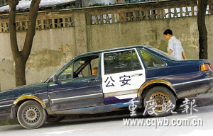 昨上午,記者在天臺崗小學附近,找到了這輛車牌為渝AY1069的“警用”桑塔納。因車身實在怪異,吸引了不少路人觀望,但駕駛員卻毫不在意。記者上前攀談,自稱二手車販的駕駛員爽快的道出了雷人“警車”的來龍去脈。最近,他收購了這輛有11年車齡的桑塔納,因車況太差,只好找了一些舊車部件更新,其中就包括這兩扇來自報廢警車的車門:“現在停在這里,正是因為水箱過熱。”