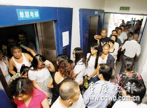 3日晚7時,記者在金島花園E-House大廳發現,單層電梯前已排了20多個人,因大廳沒空調,燥熱難當,部分市民急得大聲罵娘。怕滋生事端,物管派來幾名保安現場維護秩序,發現有插隊的居民,出面制止。