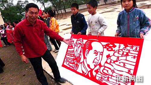 中新網伊川9月17日電(記者 齊永 通訊員 曹福川) 9月16日,伊川縣高山鄉奮進礦小學60名小學生,把老師以十首紅歌內容為主題剪成的剪紙作品展示出來,以此迎接國慶60周年的到來。