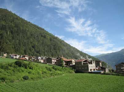 這就是“白菜公主”居住的砍竹村上寨,藍(lán)天、森林、草場(chǎng)、白菜地、石砌藏房,真是世外桃園。該村距317國(guó)道僅兩公里,有路況較好的通村公路連接國(guó)道,是自駕游理想的目的地。