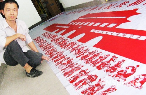 二十四日,記者看到,該剪紙長約十米,寬兩米,以紅白兩色為主,線條活潑流暢,人物形態逼真。剪紙上方為“熱烈慶祝中華人民共和國成立六十周年”十七個大字;中間接紅色天安門城樓,顯得巍峨壯觀;再往下是天安門廣場,五十六個民族的代表分兩行排列,身著獨具民族特色的服飾,或歡歌或舞蹈,五十六個民族團結一致、喜迎國慶之情躍然于紙上。