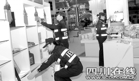 昨晚10點(diǎn),新會展中心各展館里一片忙碌。在一群正在安檢的帥氣黑衣特警中間,3個扎著發(fā)髻的女特警格外引人注目。除負(fù)責(zé)現(xiàn)場指揮的教導(dǎo)員吳虹外,28歲的羅蕾正用伸縮臂鏡檢測著一食品展臺頭頂?shù)闹樱衲陝側(cè)刖闹苋兀瑒t彎腰在一排展柜前仔細(xì)檢查著。和男特警一樣,她們都穿著帥氣的黑色警服,戴著警帽,不施粉黛,右胸前印有“成都特警”4個大字的閃光背心,將她們襯得格外颯爽。