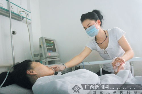 11月8日中午,記者根據帖子上所留的手機號碼聯系上了楊霏。“姐姐,你睜開眼睛看看我啊,睜大一點,乖,就是這樣!”當天12時30分,在廣西醫(yī)科大一附院神經內科一病區(qū)7樓的病房,楊霏和剛進食完的姐姐在說話。楊霏的大姐楊耀仙躺在病床上,鼻口插著氧氣管,整個身體干瘦得只剩下皮包骨頭,神志也是迷糊不清。楊耀仙現在不能自行進食,只能靠親人從連接在身體上的幾條塑料管注射一些醫(yī)院配制的流體食物維持生命。而楊霏也不時拿起姐姐的手和腳做一些物理按摩。“我姐姐這兩天病情有所變重了。”見到記者,她給姐姐蓋好被子,示意到樓梯口說話。
