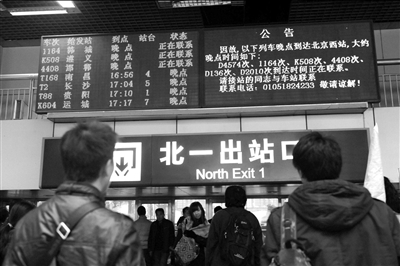 受10日以來(lái)石家莊暴雪影響,經(jīng)京廣線進(jìn)京的列車大面積晚點(diǎn)。昨天(11日),共有124趟進(jìn)出北京西站的列車晚點(diǎn),大量旅客的行程受到影響。為此,北京西站啟動(dòng)應(yīng)急響應(yīng),開(kāi)放全部候車大廳,旅客可選擇全額退票。 昨天下午4點(diǎn)多,記者在北京西站進(jìn)站大廳內(nèi)看到,顯示屏上有17趟從西站始發(fā)的列車顯示為晚點(diǎn),還有7趟列車未標(biāo)明發(fā)車時(shí)間。在屏幕下方,滾動(dòng)字幕顯示晚點(diǎn)列車信息。各個(gè)候車室外均增加了鐵路工作人員,負(fù)責(zé)維持秩序并做解釋工作。