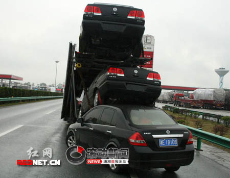 當日下午4點20分左右,高速交警邵懷大隊隆回中隊民警黃始杰、羅權趕到事發現場,在由東往西方向的洞口服務區入口處,一輛牌號為湘E1B1**的尼桑小車一頭撞進牌號為吉A955**的掛車尾部,將掛車車尾所裝載的捷達小車高高的頂起,而尼桑小車的左前輪在劇烈的撞擊下已經破裂。