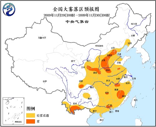 預計29日早晨到上午,西北地區東部、華北中南部、遼寧中部、黃淮中西部、江淮大部、江漢、江南大部、華南大部以及四川盆地大部、重慶大部、貴州西北部、云南南部等地有輕霧,其中,北京南部、天津、河北中部和西南部、山西中南部、河南中部、陜西中部、四川盆地南部、湖南中部、江西北部和東部、福建西部、廣東中部、云南南部等地的部分地區有能見度小于1000米的霧,局地能見度不足200米。