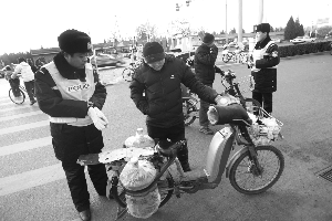 昨日下午,天壇東門路口。一輛闖紅燈的電動自行車騎車人被交警攔下時,交了20元罰款。5分鐘內,天壇東門路口接連攔下三輛電動自行車,另兩人均因違法載物———車上綁有大個桶裝水,受到20元罰款處罰。其中一人表示,剛知道電動自行車不得載人載物。