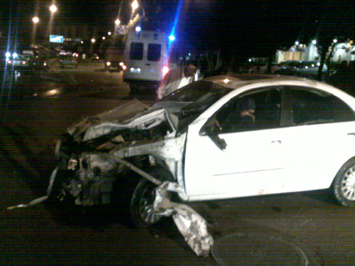 記者在現場看到,二層橋面快到坡底的隔離欄已經完全撞破,開出一個大約25米的缺口,而白色轎車則停在離隔離欄缺口約50米遠的地方,車頭等部位受損嚴重幾乎接近報廢。轎車駕駛員癱坐在人行道邊,有輕微的受傷,身披一件警用大衣,但不見肩章和警號,身上散發著濃烈的酒氣,對于民警的詢問幾乎無法正常作答。