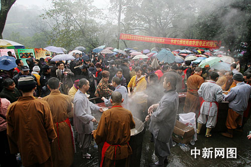 中新網(wǎng)重慶1月22日電 (孟幻)今天是中國(guó)農(nóng)歷臘月初八,天空雖然飄著小雨,有些許寒意,數(shù)萬山城市民仍是涌入當(dāng)?shù)厝A巖寺喝臘八粥,過臘八節(jié),期望來年增福增壽。