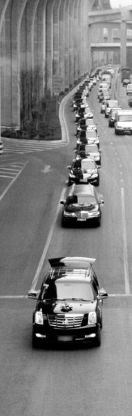 中午12點,這個婚車隊又出現(xiàn)在了穿金路上。一輛凱迪拉克越野車排在車隊最前方,負(fù)責(zé)開道和攝像。新郎、新娘乘坐的加長林肯緊隨其后,7輛奔馳S350和1輛奔馳320行駛在車隊靠前方陣,7輛寶馬X5和3輛凱迪拉克位于車隊中間,3輛保時捷卡宴押后。這些車輛除兩輛為重慶牌照、一輛為廣州牌照外,其余車輛均掛著昆明本地車輛號牌。車內(nèi)的人不時搖下車窗,幾乎所有車輛上的司機和乘客都是年輕人,其中不乏剃著光頭的時尚潮人。