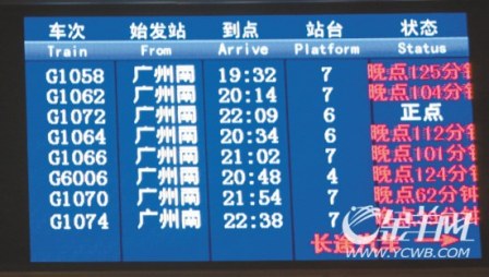 到晚上6時30分,現(xiàn)場LED顯示屏顯示,從原定下午5時06分發(fā)出的9個班次列車都處于晚點狀態(tài)中,車站所有站臺上都沒有列車?,數(shù)千旅客因此滯留廣州南站內(nèi)。