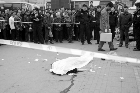 昨日11時40分許,鄭州市客運(yùn)南站門前。一身穿黑色棉襖、灰色短褲的年輕女子,躺在地上,臉上、脖子處遍布血跡。一旁,救護(hù)人員正對其救治,近百名市民議論紛紛。