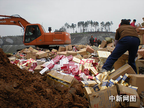 15日上午10時(shí),伴隨著大型壓路機(jī)和挖掘機(jī)工作的隆隆聲,3萬(wàn)多條假冒卷煙在宜昌市夷陵區(qū)丁家壩垃圾處理場(chǎng)被碾壓后填埋銷(xiāo)毀。