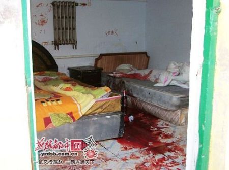 據(jù)旅店老板介紹,12日下午三點(diǎn)多,她看到小明小亮居住的房間門前有幾個(gè)血腳印,心里想這是怎么了,就上前敲門,里面的人不開門,她繼續(xù)敲門,門終于開了,她也被眼前的場景驚呆了:“屋子里的血流了一地,其間還夾雜著醉酒的嘔吐物,大片的血跡中間是兩個(gè)啤酒瓶子。兩個(gè)男孩一個(gè)蹲坐在地上,一個(gè)坐在床上,一邊墻上用血寫著‘XX,我愛你’,一邊寫著‘我錯(cuò)了,我愛你……’ ”