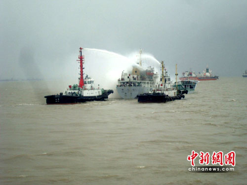 中新網泰4月15日電 (陳天斌 朱曉穎)14日下午,在長江泰州八圩段汽渡附近江中停泊區,一寧波籍貨船鍋爐突然爆炸起火。江蘇泰州市消防支隊靖江大隊接警后,輪渡“馱”著消防車駛入江中滅火。