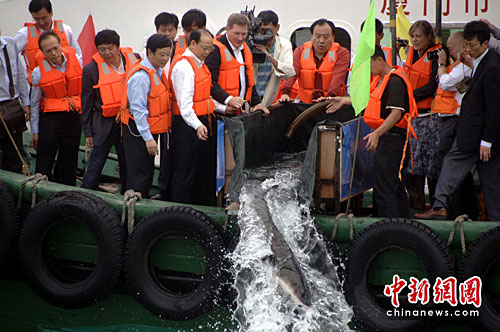 中新社廈門4月22日電 (記者 陳悅)22日下午,廈門在九龍江雞嶼海域放流108尾有“魚類活化石”之稱的中華鱘。其中四只在海洋公園保育基金贊助下,首度配上“衛星追蹤信標”,相關專家表示,這將是中華鱘研究及保育的一大突破,將開展有效保育中華鱘新的一頁。