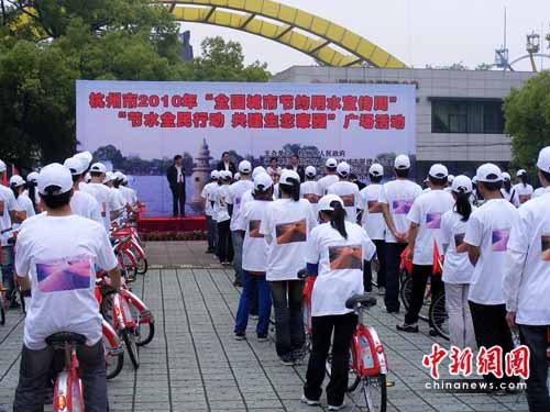 中新網(wǎng)杭州5月15日電(記者 趙曄嬌 實習(xí)生 徐進(jìn)軍)今天,杭州市“全國城市節(jié)約用水宣傳周”活動在該市少年宮廣場舉行,由近五十名大學(xué)生組成的節(jié)水志愿者車隊騎著公共自行車環(huán)繞西湖,倡導(dǎo)“節(jié)水減排,綠色出行”,提高市民低碳意識。據(jù)悉,杭州水資源緊缺的矛盾日益嚴(yán)峻,僅去年末總蓄水量就較2008年同期減少10.14億立方米,相當(dāng)于減少近100個西湖的水量。