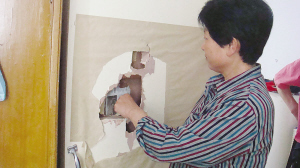 記者看到304室北面小屋的門(mén),有一部分用牛皮紙貼上,輕輕撕開(kāi)紙,赫然出現(xiàn)一個(gè)大洞。她說(shuō)這是有天早晨喊女兒起床時(shí)敲通的。一個(gè)年過(guò)半百的女子,竟然敲門(mén)時(shí)就輕易地把門(mén)敲通,可見(jiàn)這門(mén)板的質(zhì)量。果然,記者很輕易就掰下一塊面板,這種復(fù)合木板的厚度不到3毫米,難怪經(jīng)不起“敲”。