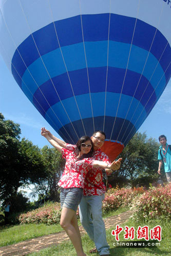 全國的30支熱氣球隊來助興。在海口萬綠園上空漂游的熱氣球上,北京的劉先生突然“變出”一枚鉆戒向女友求婚。他笑著說,從網上看到海口旅游婚慶的消息就瞞著女友報了名,為的是上演在熱氣球上求婚一幕。