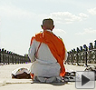 26日,在吉林省長春市偽滿皇宮博物院抗日英烈廳內,一位身穿黃色僧袍、手持“太鼓”的日本僧人向廳內的“抗日英烈塔”深深鞠躬,為當年侵華日軍的罪行謝罪。(記者王艷秋 實習記者 畢強長春報道)