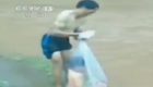 實拍越南男子用塑料袋運孩子過河上學