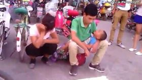 年輕夫妻抱男童街頭乞討 民警怒斥